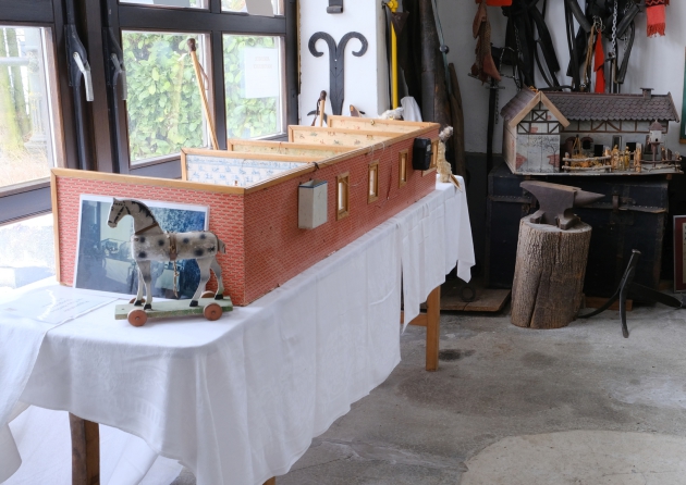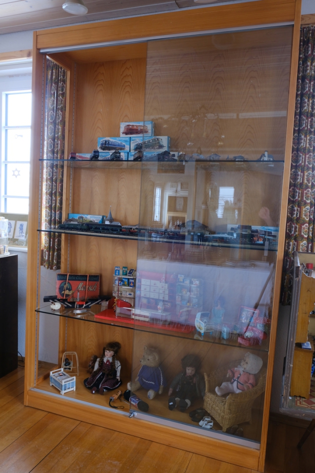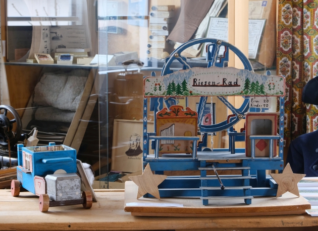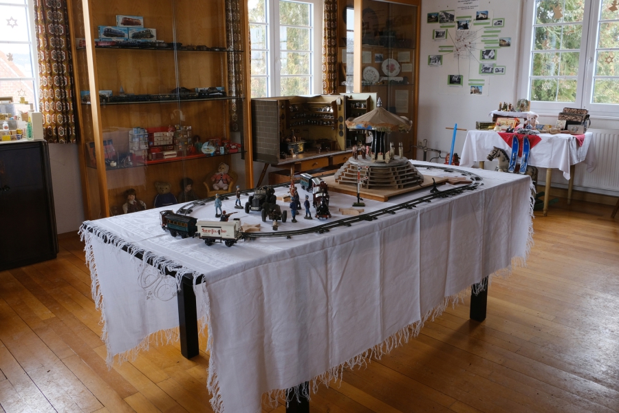 Im Mittelpunkt standen historische Spielzeuge. Der Tisch zeigt neben einem handbetriebenen Karusell eine Märklin Modelleisenbahn von 1922 (die Lokomotive ist zum Aufziehen).